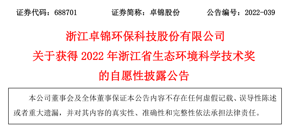 關于獲得2022年浙江省生態(tài)環(huán)境科學技術獎的自愿性披露公告