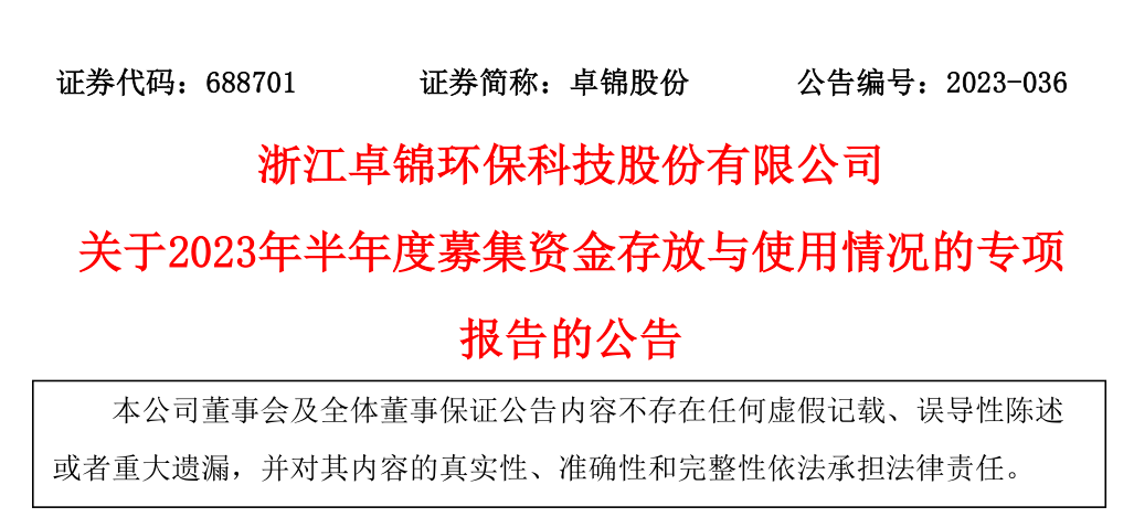 附件:浙江卓錦環(huán)??萍脊煞萦邢薰娟P(guān)于2023年半年度募集資金存放與使用情況的專項報告的公告