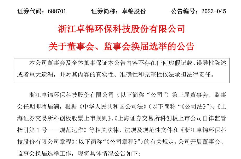 附件:浙江卓錦環(huán)保科技股份有限公司關(guān)于董事會(huì)、監(jiān)事會(huì)換屆選舉的公告