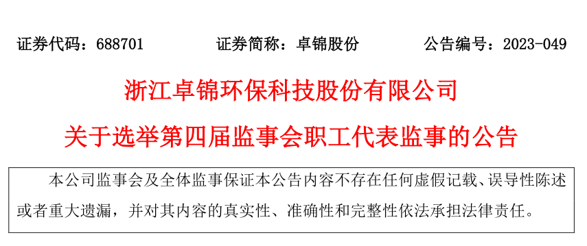 浙江卓錦環(huán)保科技股份有限公司關于選舉第四屆監(jiān)事會職工代表監(jiān)事的公告
