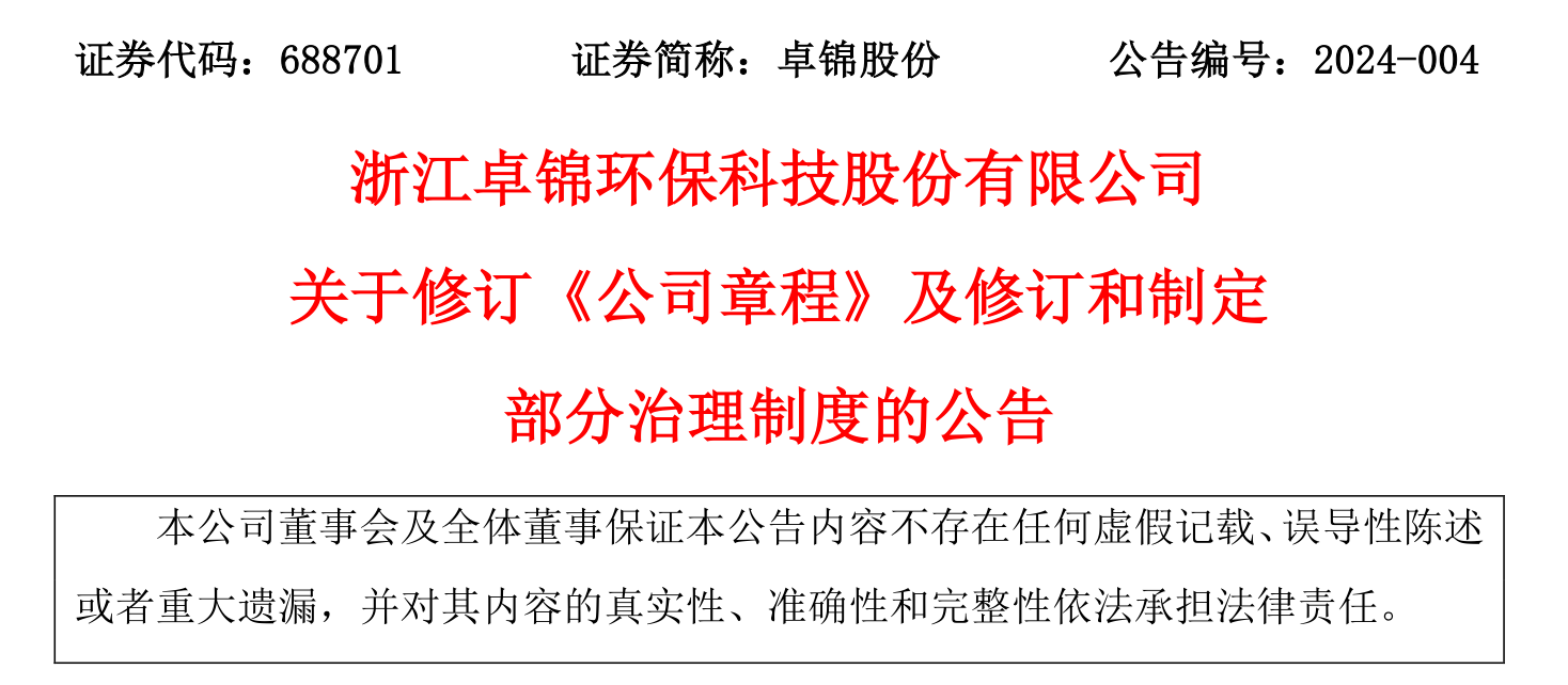 附件:浙江卓錦環(huán)??萍脊煞萦邢薰娟P(guān)于修訂《公司章程》及修訂、制定部分治理制度的公告
