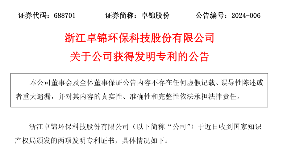 浙江卓錦環(huán)保科技股份有限公司關(guān)于公司獲得發(fā)明專利的公告