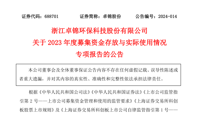 附件:浙江卓錦環(huán)??萍脊煞萦邢薰娟P(guān)于2023年度募集資金存放與實(shí)際使用情況專項(xiàng)報(bào)告的公告