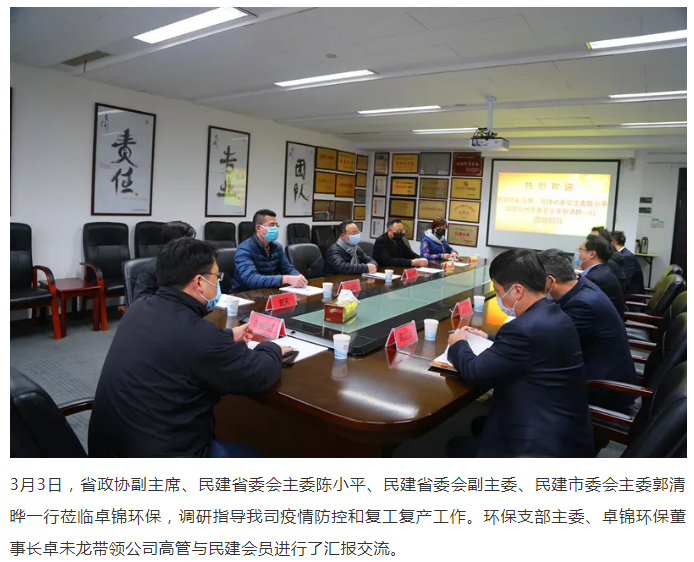 致力抗疫 服務(wù)發(fā)展——省政協(xié)副主席、民建省委會主委陳小平、民建省委會副主委、民建市委會主委郭清曄一行走訪調(diào)研卓錦環(huán)保