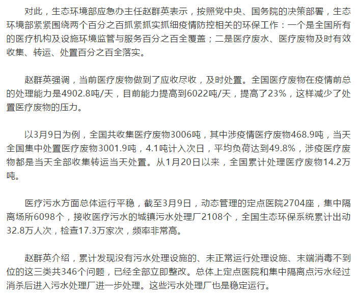 生態(tài)環(huán)境部:1月20日以來(lái)累計(jì)處理醫(yī)廢14.2萬(wàn)噸,污水處理末端消毒不到位等問(wèn)題已全部整改