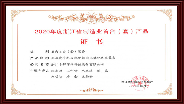 卓錦股份自主研發(fā)的“高濃度有機(jī)廢水電解催化氧化成套裝備”成功入選2020年度浙江省裝備制造業(yè)重點(diǎn)領(lǐng)域首臺(套)產(chǎn)品。